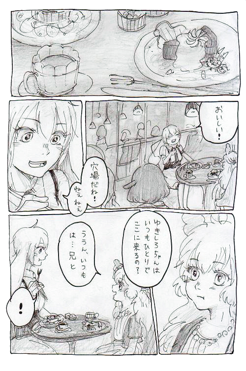 ゆきしろのお気に入りのお店前で好奇心旺盛なアリスのような少女と出会い、兄についてのお茶会をする話。