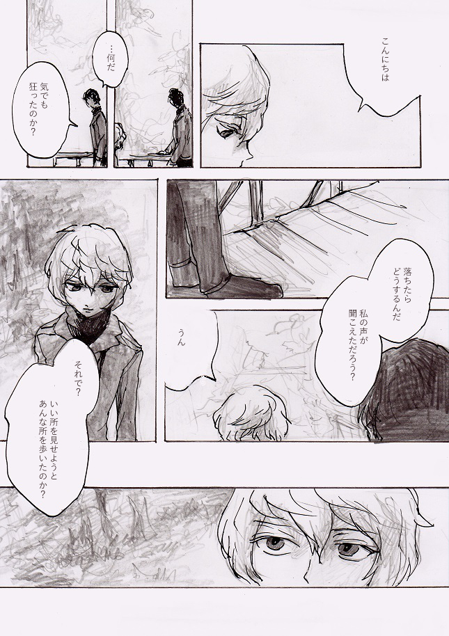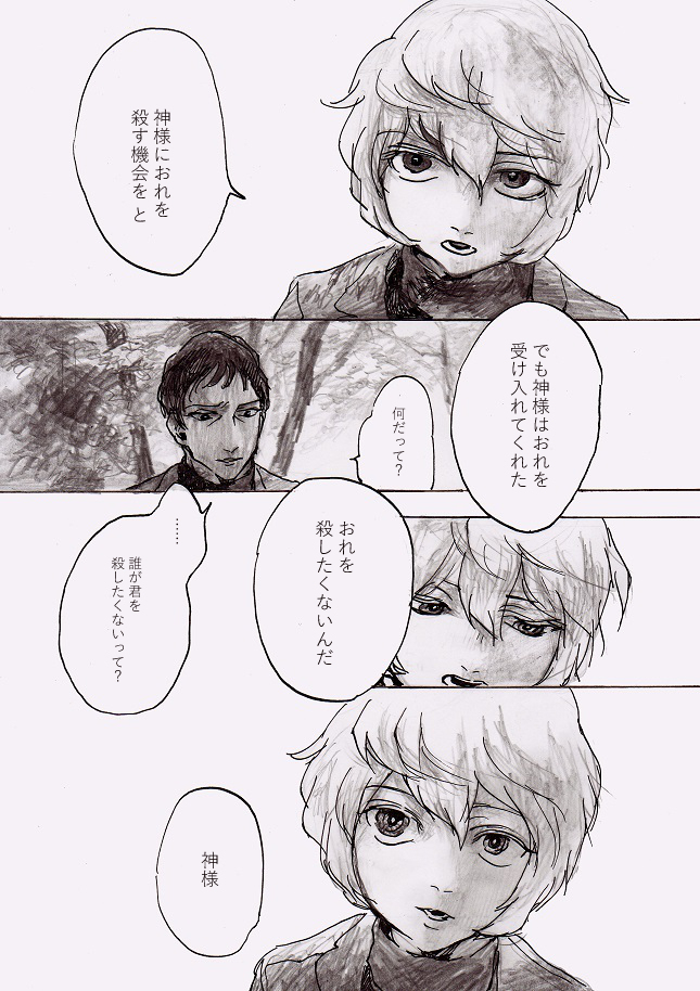 『白いリボン』パロディ(遊真) (14-15/?/?)映画『白いリボン』のワンシーンのパロディです。 遊真が車にひかれるダメージでもすぐ回復する身体なのは、おそらくライモンドも知っているはずで、そのうえで危険な行為に対して遊真の身を案じてくれるだろうなと思う。そして遊真は神様なんて全く信じていないだろうということと、それはそれとして宗教の在り方に理解は寄せているだろうなと思う。