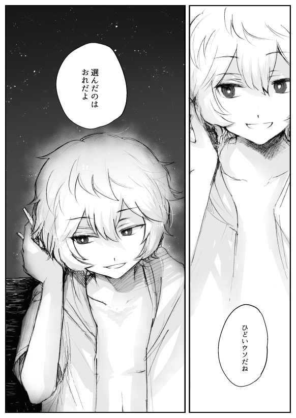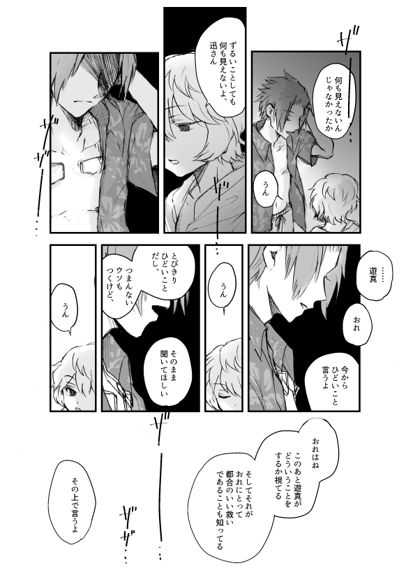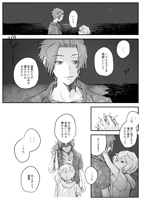 懺悔の海 (18/12/9)お題「遊真と夏の海」+「空閑遊真に懺悔する迅悠一」リクエストボックスより、ありがとうございました。 血潮の音がきこえるはずない肉体の遊真に、迅さんが許しを請うことはないだろうなと思いつつ……素敵なお題でした。選んだ未来がどう転ぶかわからない、夜の海は暗闇の中で命がうごめいているから怖いなと感じます。